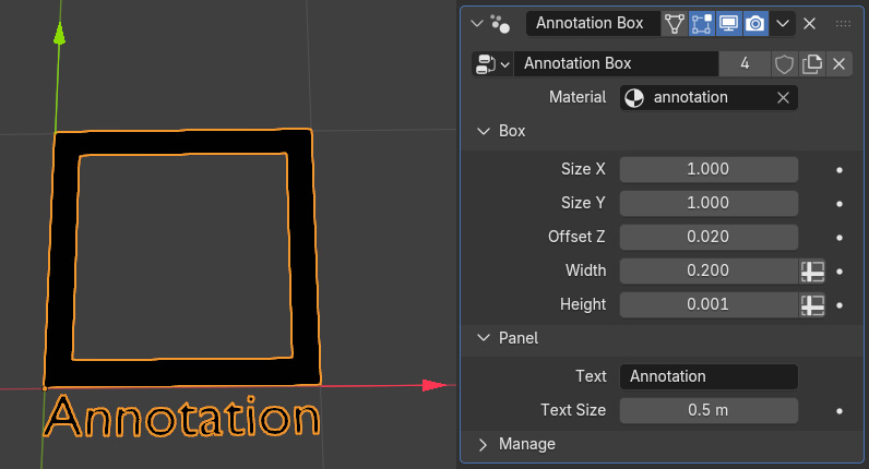Additionally I added the possibility to choose the width (thickness) of the box, an offset from the ground (if you have a ground plane so it does not get hidden) and text size.