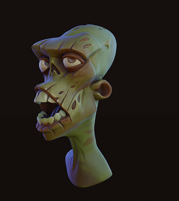 Here’s a quick model of a zombie head I did. I would call it more of a “sketch” since it was quickly sculpted and automatically retopologized. What I wanted to achieve is some painterly looking textures while still being PBR.